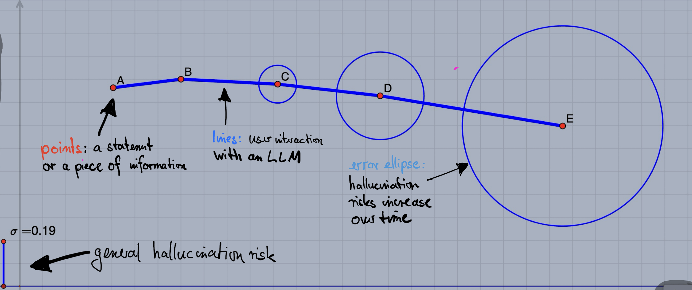 Lines: Connecting points are akin to interactions—user inputs and corresponding LLM responses. The length of the line may indicate how close (or far away) you are to the previous statement in terms of information content. A sequence of line segments corresponds to a dialog where the risk of hallucination may increase.